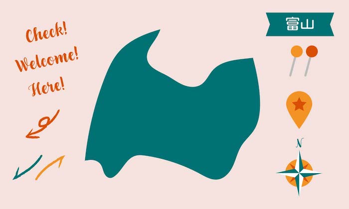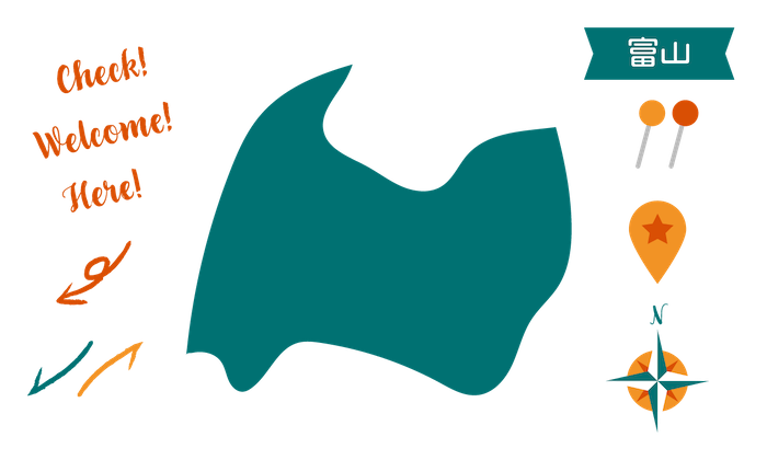 富山の地図 ピンと矢印のセットです。pngをダウンロードすると背景色が透明のファイルをダウンロードできます。