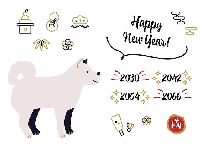 犬のイラスト 戌 干支 年賀状素材セットのイラストです。pngをダウンロードすると背景色が透明のファイルをダウンロードできます。