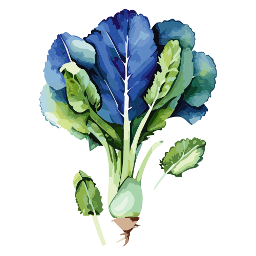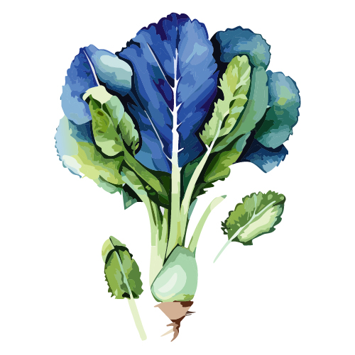 水彩で描かれたケールのイラストです。鮮やかな緑色とブルーの葉が特徴的です。ポスターやカード、健康食品のパッケージなど様々な用途に適しています。