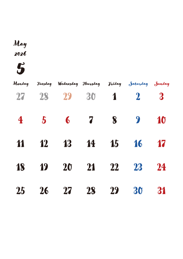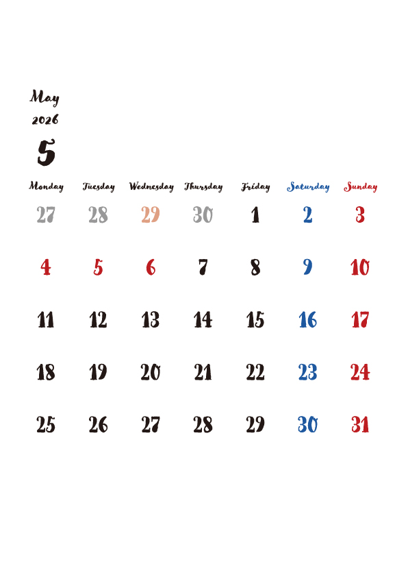 2026年5月のカレンダーを無料でダウンロードできます。上下に余白があるので、お知らせを書き込んだり、イラストや画像を追加したり、自由にレイアウトが可能です。