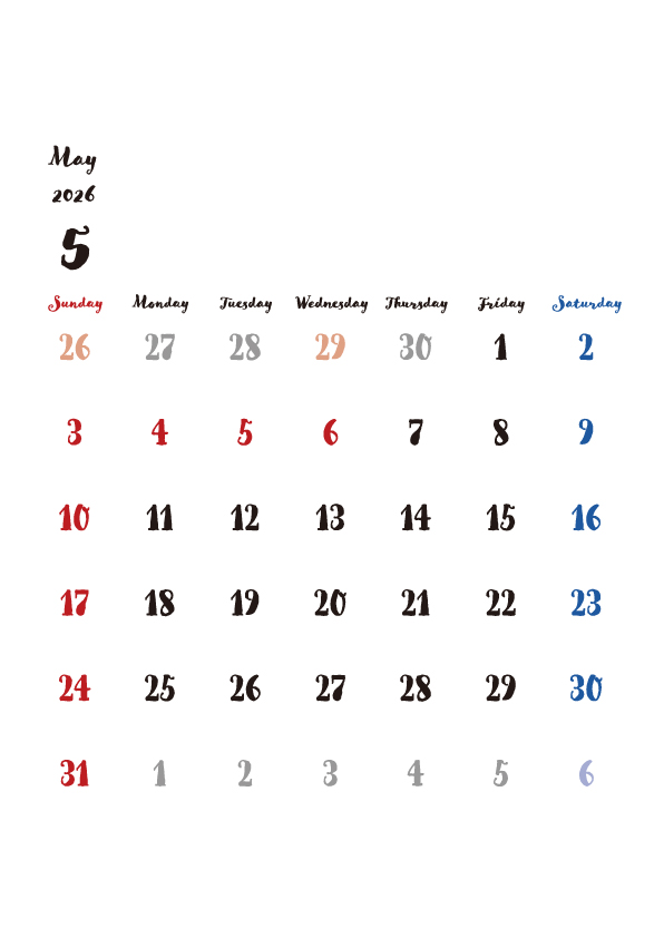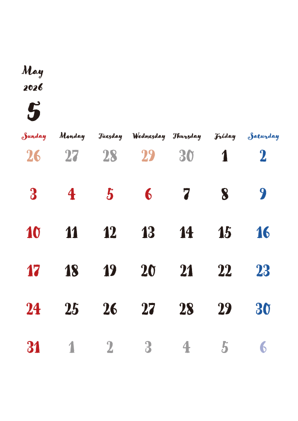 2026年5月のカレンダーを無料でダウンロードできます。上下に余白があるので、お知らせを書き込んだり、イラストや画像を追加したり、自由にレイアウトが可能です。