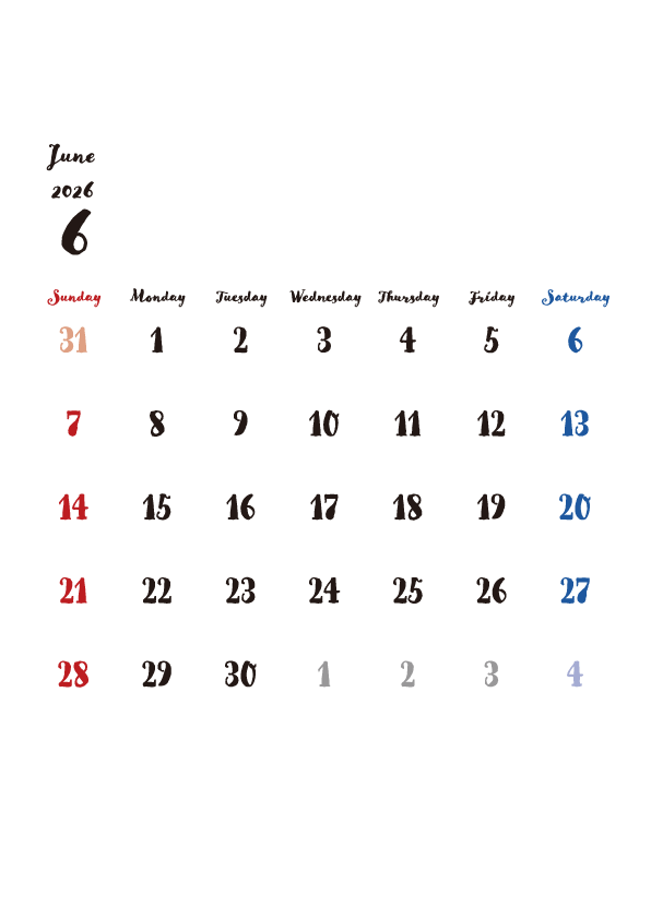 2026年6月のカレンダーを無料でダウンロードできます。上下に余白があるので、お知らせを書き込んだり、イラストや画像を追加したり、自由にレイアウトが可能です。