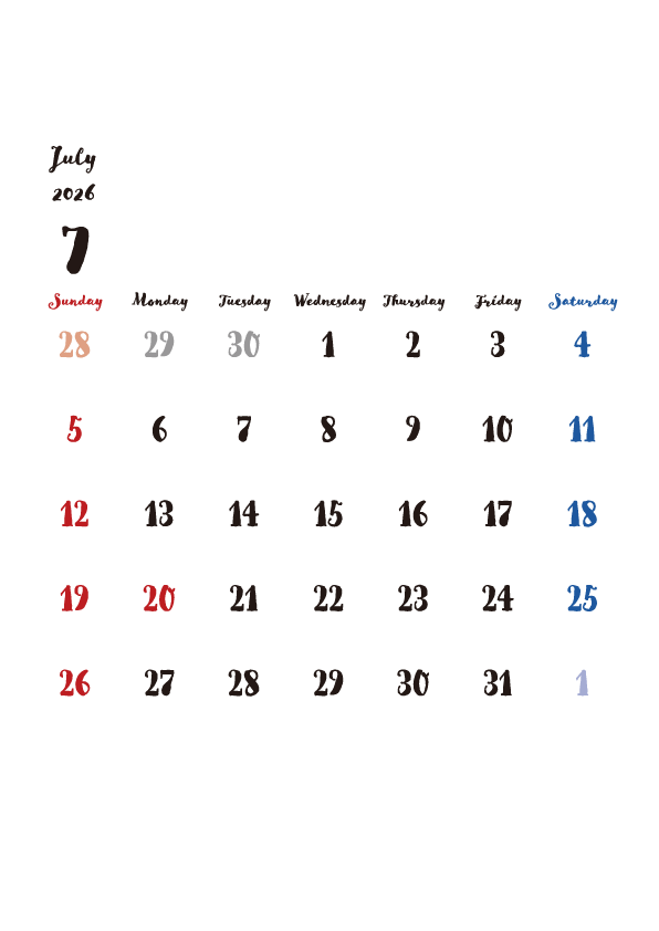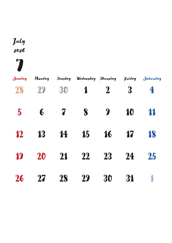 2026年7月のカレンダーを無料でダウンロードできます。上下に余白があるので、お知らせを書き込んだり、イラストや画像を追加したり、自由にレイアウトが可能です。