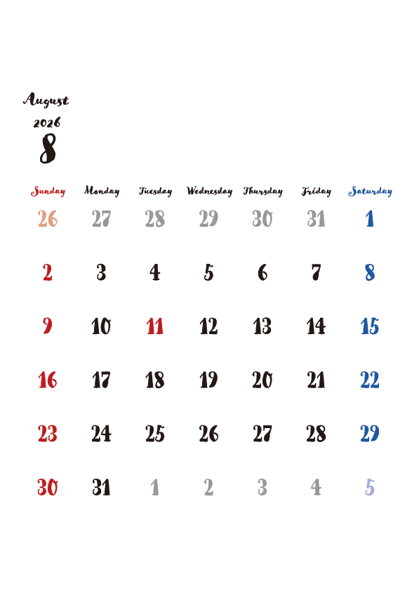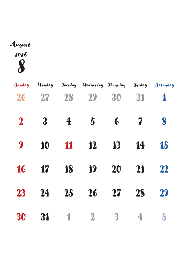 2026年8月のカレンダーを無料でダウンロードできます。上下に余白があるので、お知らせを書き込んだり、イラストや画像を追加したり、自由にレイアウトが可能です。