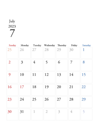2026年7月のカレンダーを無料でダウンロードできます。上下に余白があるので、お知らせを書き込んだり、イラストや画像を追加したり、自由にレイアウトが可能です。